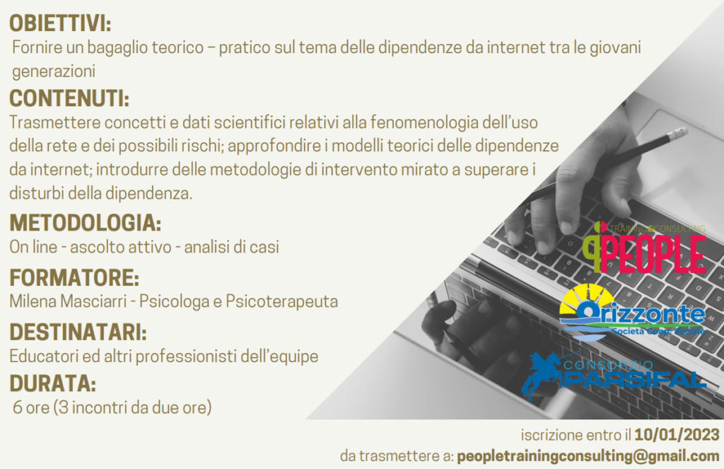 La cooperativa sociale Orizzonte, congiuntamente al Consorzio Parsifal, con il supporto della società di formazione People Training & Consulting, organizza un percorso di formazione, articolato in più corsi su vari temi, destinato agli operatori impiegati nel servizio sociopsicopedagogico.