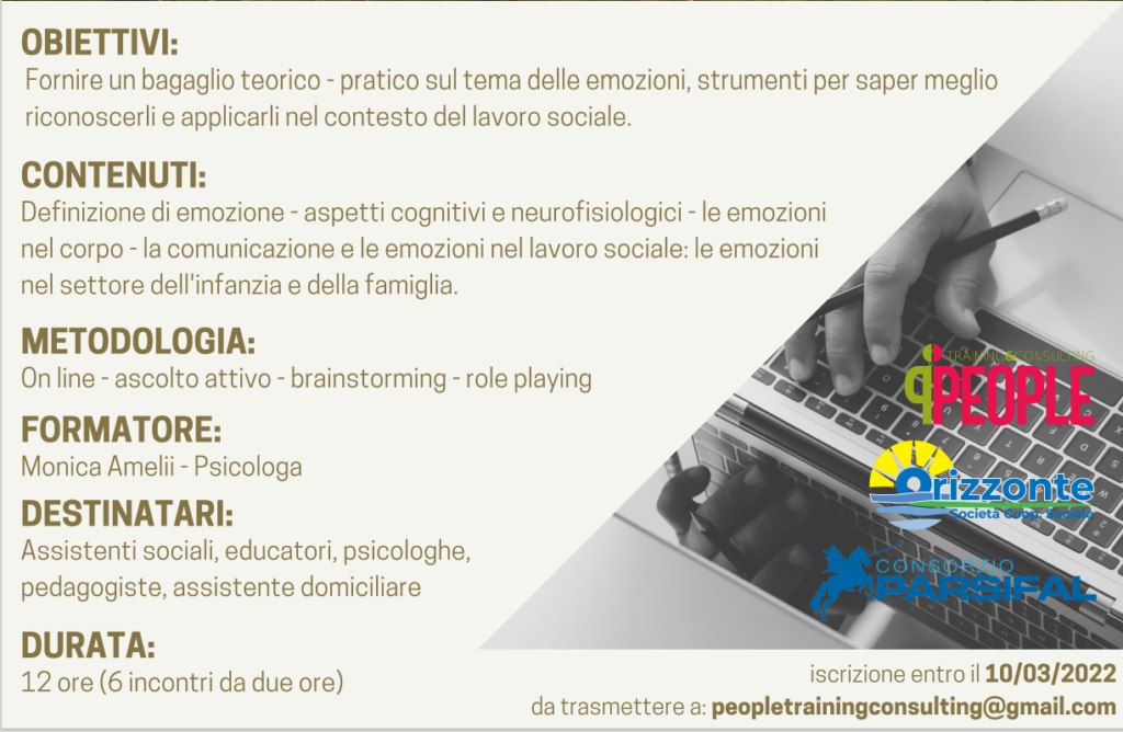 La cooperativa sociale Orizzonte, congiuntamente al Consorzio Parsifal, con il supporto della società diformazione People Training & Consulting, organizza un percorso di formazione, articolato in più corsi su vari temi, destinato agli operatori impiegati nel servizio sociopsicopedagogico.
