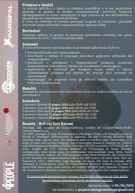 Il Consorzio Parsifal e le cooperative sociali ORIZZONTE e SAMIDAD, con il supporto tecnico di PEOPLE TRAINING & CONSULTING, organizzano un corso di formazione gratuito destinato al personale addetto al servizio di assistenza specialistica scolastica che opera nell’ambito ECAD 9 – Val di Foro (Francavilla)