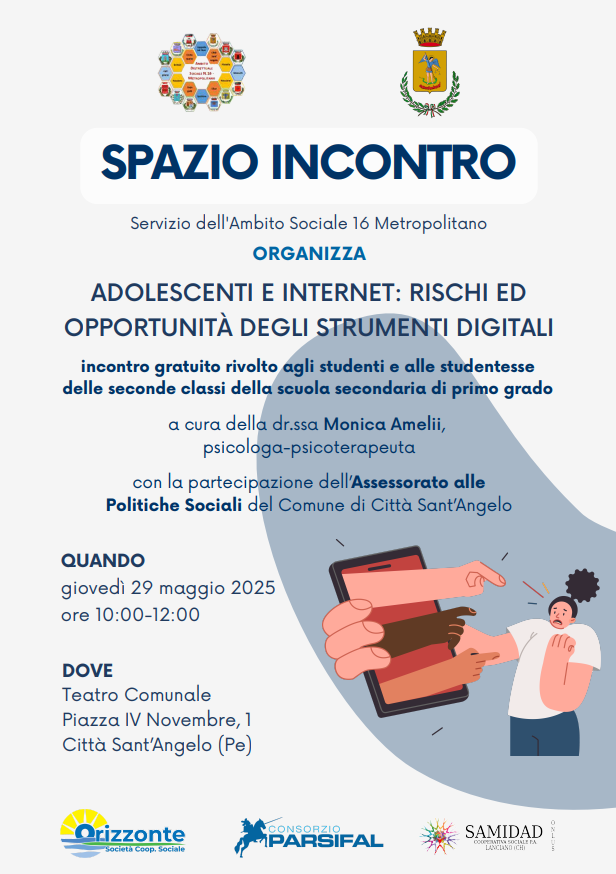 Il Consorzio Parsifal insieme alle Cooperative Sociali Orizzonte e Samidad organizza incontro gratuito rivolto agli studenti e alle studentesse della scuola secondaria di primo grado dell’Istituto Comprensivo Città Sant’Angelo presso il Teatro Comunale di Città Sant’Angelo.